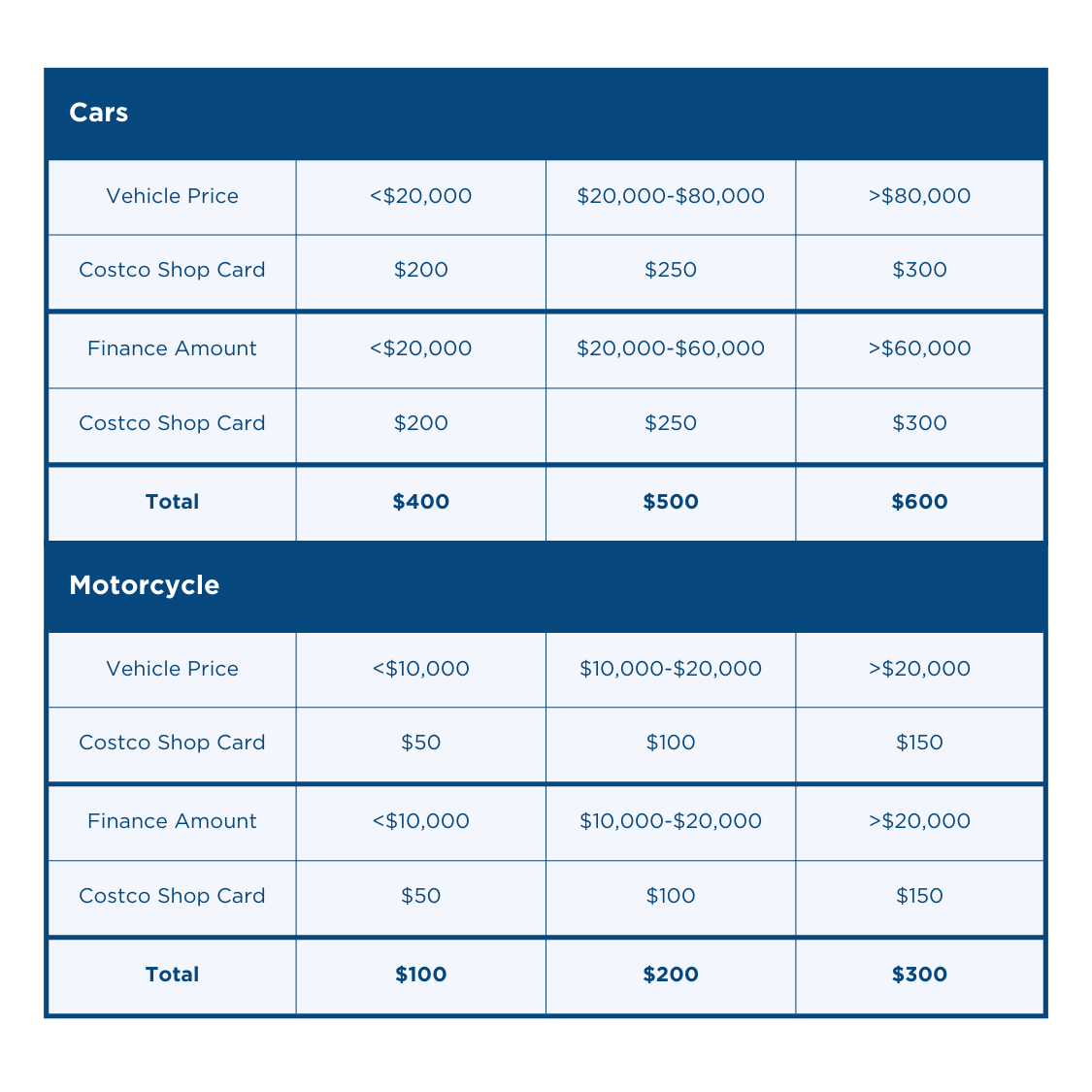 Costco Executive Members get a Costco Shop Card worth up to $300 for car purchases, and another Costco Shop Card Worth up to $300 for car financing. They can also get Costco Shop Cards worth up to $150 for motorcycle purchases and another Costco Shop Card worth up to $150 for motorcycle financing. The details of the Costco Shop Card promo may vary depending on the current promotions and membership types. Autoconnect is not responsible for issuing Costco Shop Cards. If eligible, your digital Costco Shop Card will be sent via email by the Costco Services team. If you have any questions regarding Costco Shop Cards, please contact costcoservices@costco.com.au